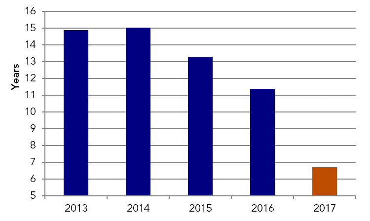 The average duration of LNG offtake contracts signed in 2017 almost halved to 6.7 years, consultancy Poten & Partners said this week, describing this as the shortest ever recorded. It compares with an average duration of 11.5 years for LNG contracts signed in 2016.