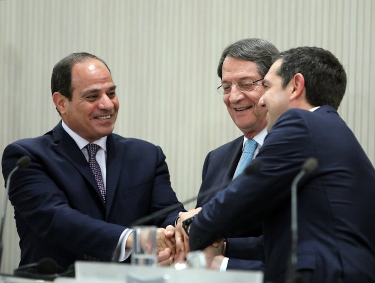 President al-Sisi (left) meeting his counterparts from Greece and Cyprus at summit last December. EPA