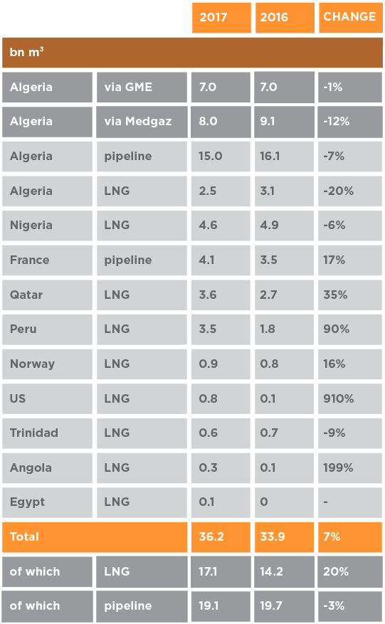 Spanish total LNG imports grew by 20% in 2017 to 17.1bn m3, inclusive of the 20% lower imports from Algeria. Thus LNG's share of overall Spanish supply increased to 47%, from barely 42% in 2016.
