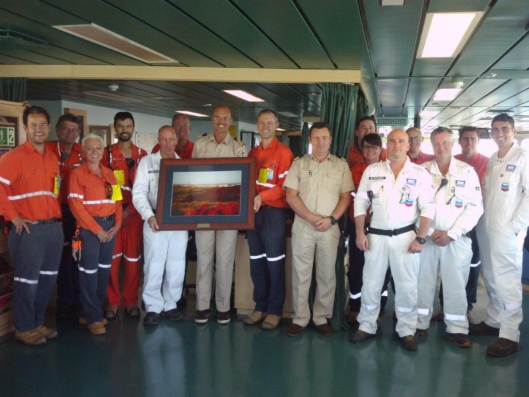 Crew aboard the Northwest Swan celebrate the loading of NW Shelf's 5,000th cargo, September 4 2018 (Photo credit: Woodside)