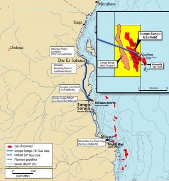 Songo Songo gas field, in shallow water to the south of the Tanzanian capital (Map credit: Swala)